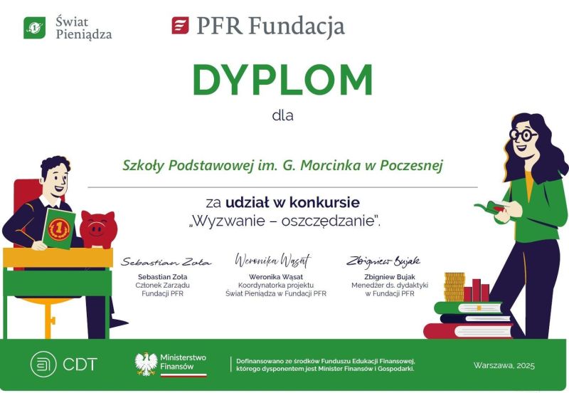 Klasa 5a wzięła udział w ogólnopolskim konkursie „Świat Pieniądza”, skierowanym do uczniów szkół podstawowych z klas IV–VIII, rozwijając swoją wiedzę o finansach, oszczędzaniu i wartości pieniądza. Uczniowie pracowali nad zadaniami konkursowymi, ucząc się, jak racjonalnie planować wydatki i zarządzać budżetem w odpowiedzialny sposób. Dzięki udziałowi w projekcie szkoła otrzymała bezpłatne egzemplarze książki „Świat Pieniądza”, które pomogą uczniom lepiej zrozumieć podstawowe pojęcia gospodarcze.